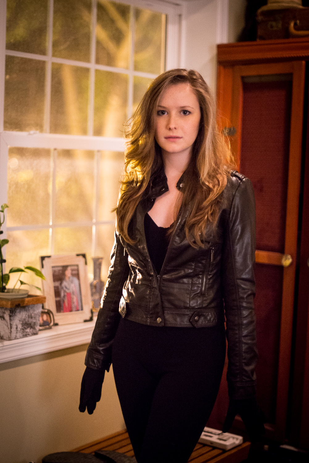 Out of all of these supplies, the only item I bought was a $5.00 can of silver hair spray from the Halloween section of CVS.  I luckily own a lot of black and even had a hand-me-down one piece black cotton/spandex suit.  If you don’t own a leather jacket, you can always borrow one from a friend!