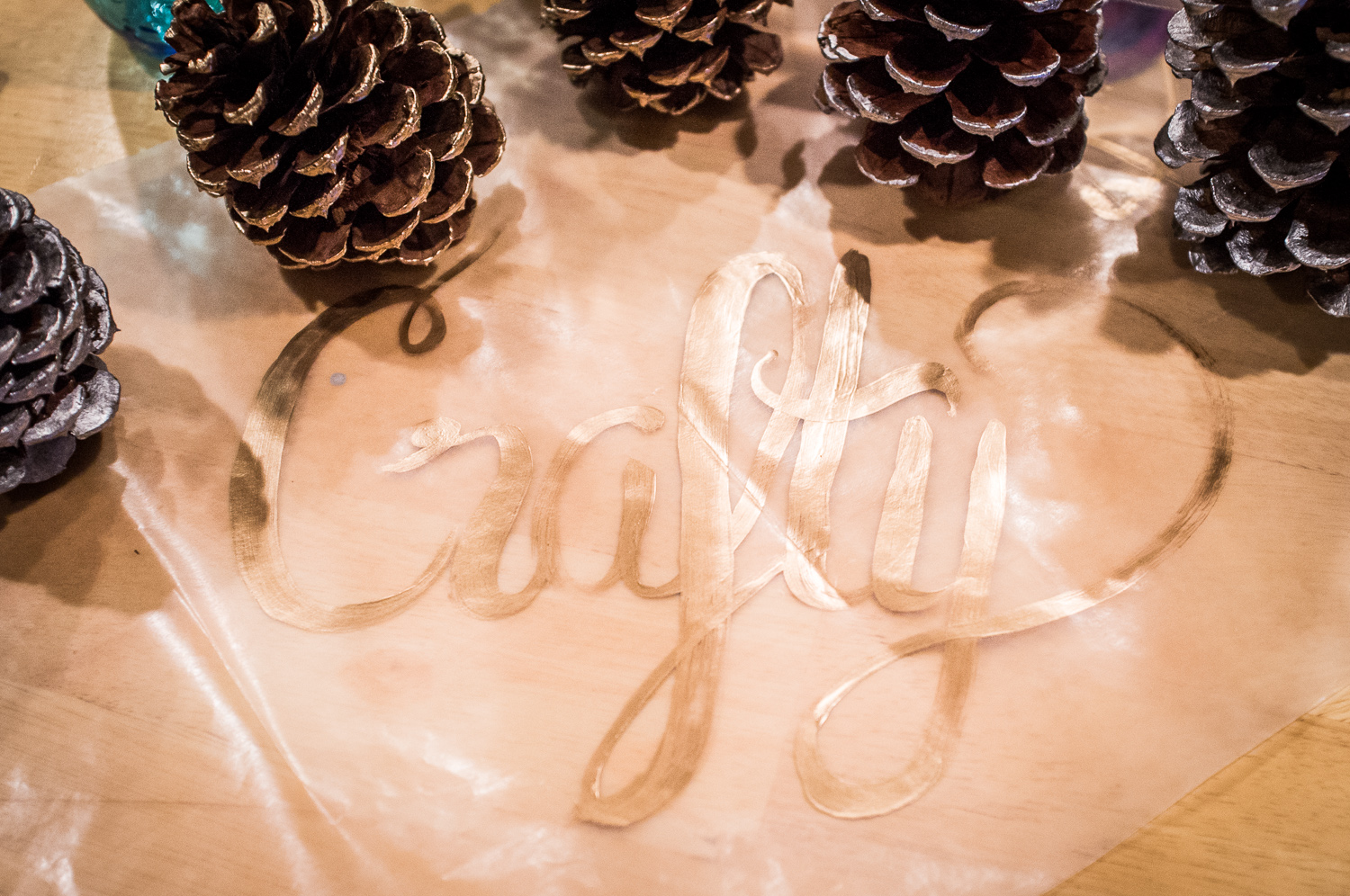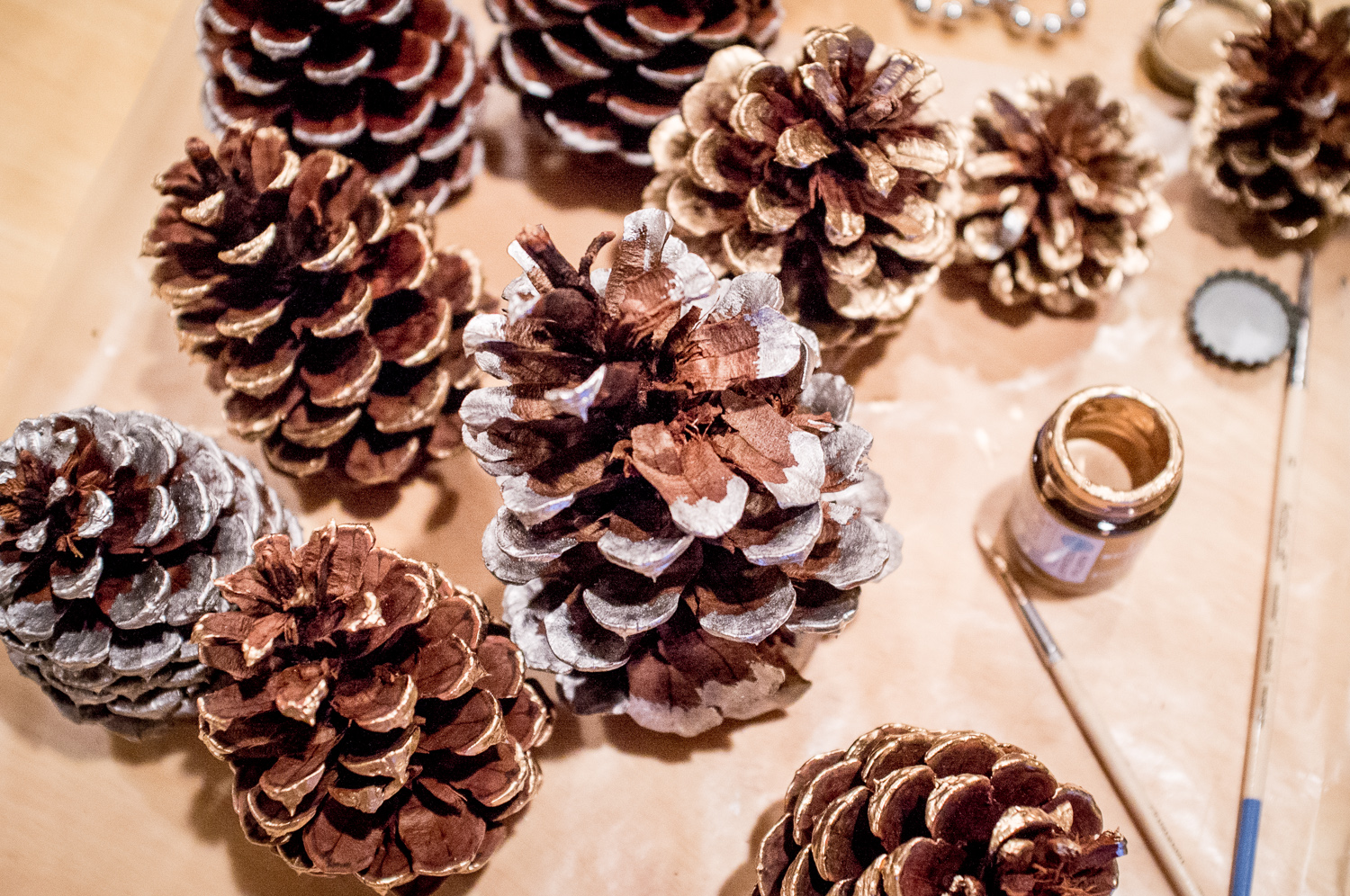 Our last craft night before the holidays featured “gold dipped” pine cones.  I thought they would be an easy and festive decoration for friends to have on display in their homes, or to give as gifts!  I found a couple of different ways to make DIY gold pine cones, but settled on the painting option [like this example from A Pear of Pears].  Michael’s has several types of metallic paint and inexpensive sets of paint brushes.  Thankfully the paint eventually washes out but it took a little bit of scrubbing, so I wouldn’t suggest using your best brushes on this project!