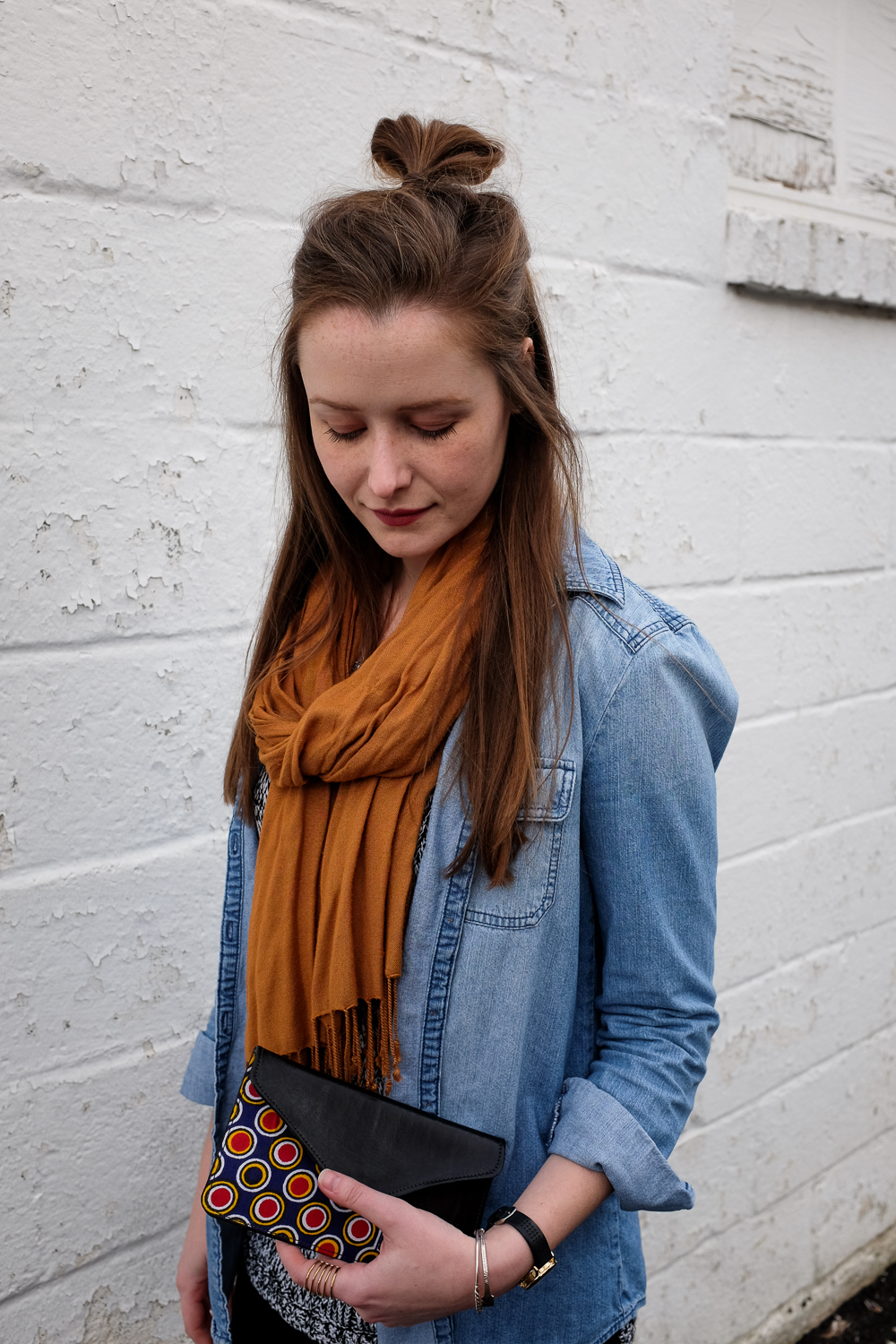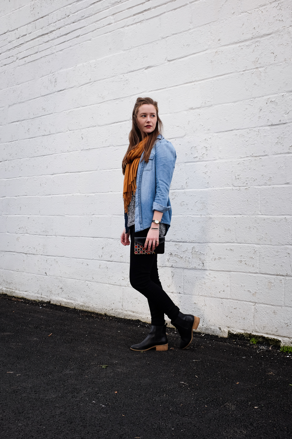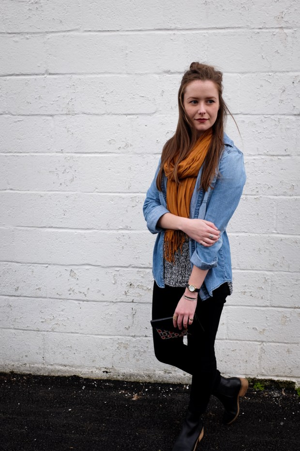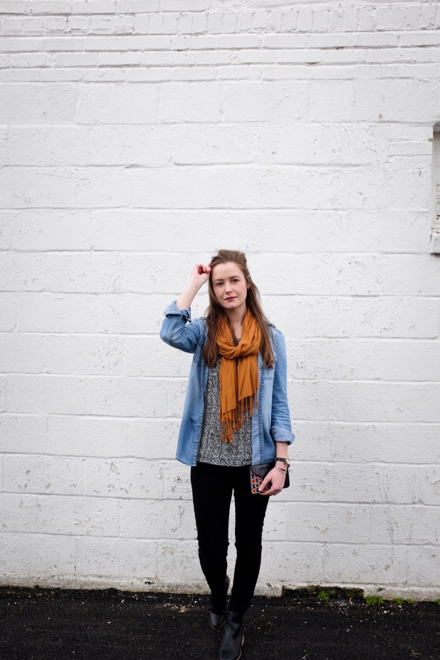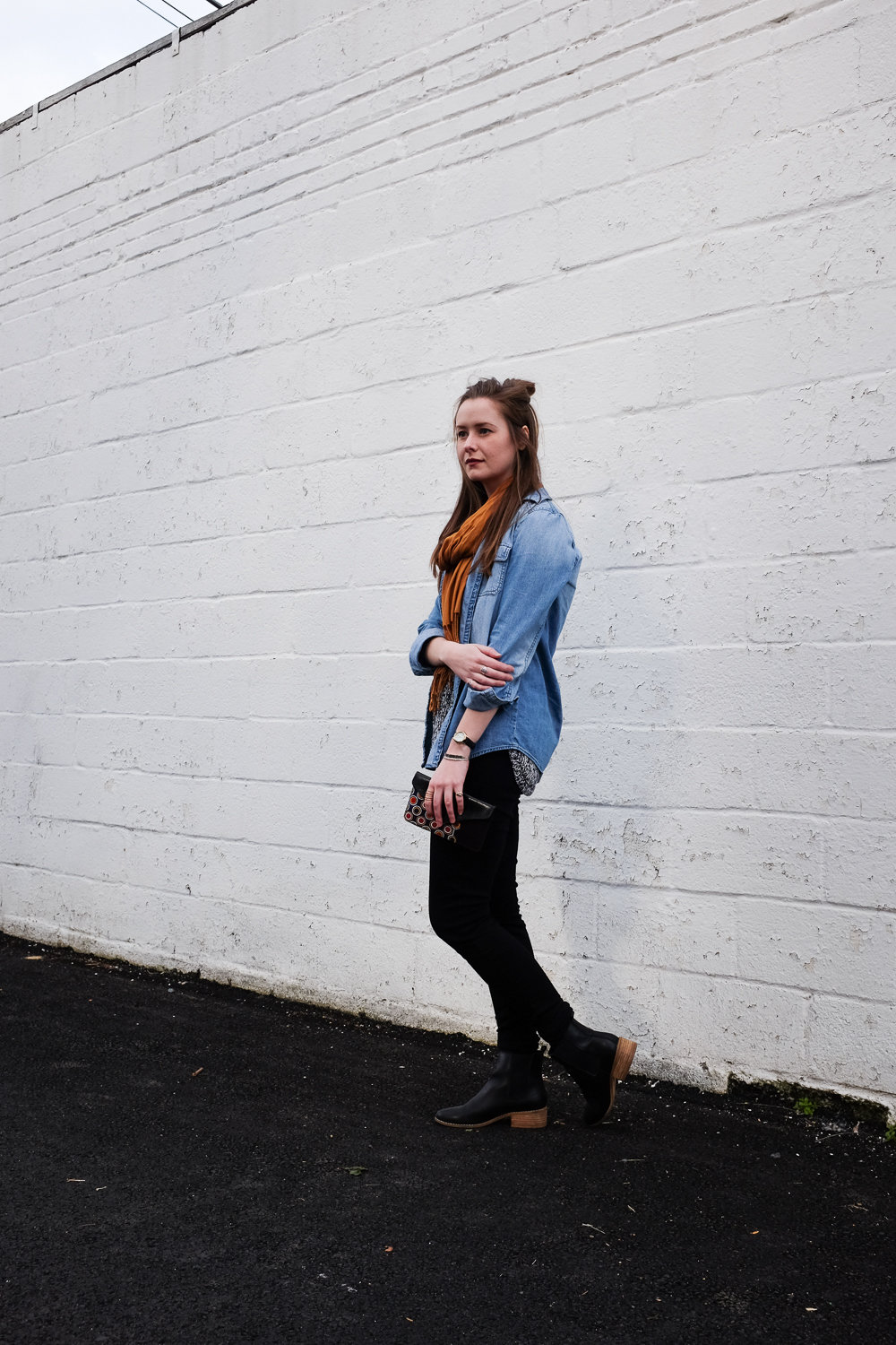 Wearing: D.Jeans, Rubbish chambray, Madewell scarf, Fulla&Fayda wallet, and GAP chelsea booties (on sale!) // Photos taken by Bryan Wallace