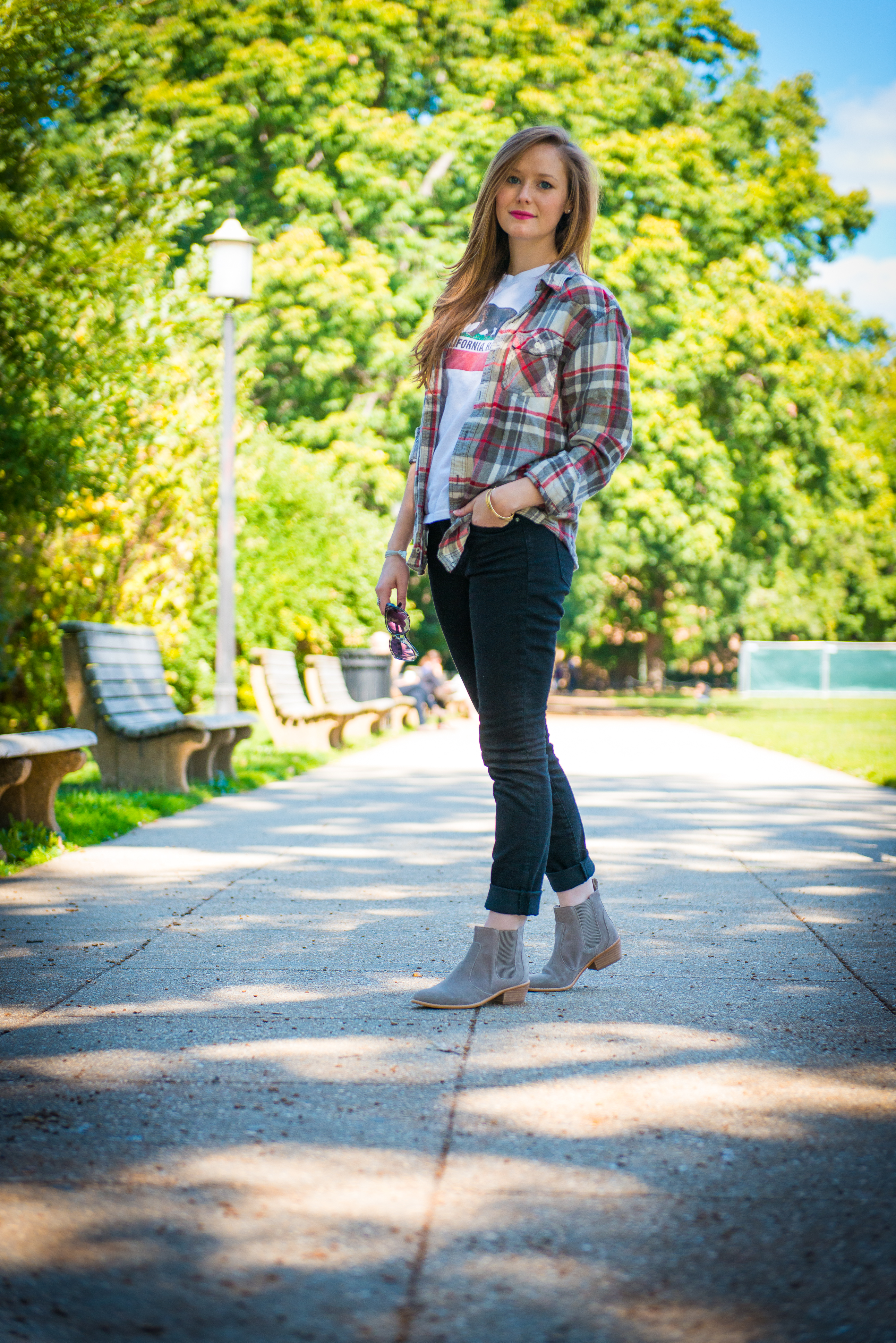 The plaid is out. I have finally transitioned my closet from my summer to fall clothes and plaid flannels have taken over. I’ve collected a few over the years, including this grey and red plaid number (a hand-me-down from my younger brother…), and they are perfect for fall. Throw one over a T-shirt or dress, pair with some cute booties, and call it a day. Didn’t I say that plaid would be one of my wardrobe staples this season?