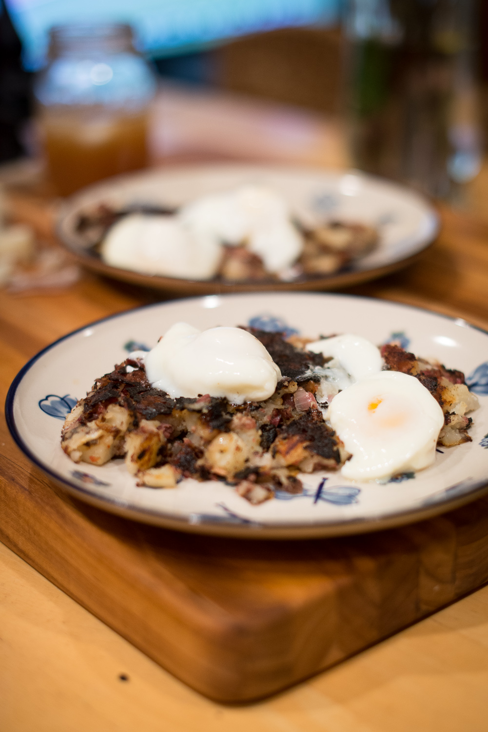 As T and I gear up for the holidays grocery shopping, picking out recipes, and buying lots of alcohol, we are also thinking of ways to use up all of that wonderful leftover turkey, ham, veggies, and potatoes that will take up our entire refrigerator. After a recent trip to Harold’s New York Deli in Edison, New Jersey, we had a lot of pastrami to eat. Three days of pastrami sandwiches later, Teddy and I needed to get creative. We looked in the fridge for a few key items: potatoes from dinner a couple nights ago; onions; eggs; and of course the delicious pastrami – the perfect ingredients for a modified corned beef hash.
